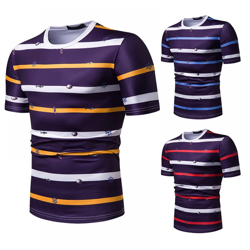 New Summer Men's Short-Sleeved T-Shirt Men's Contrast Striped Slim Casual T-Shirt