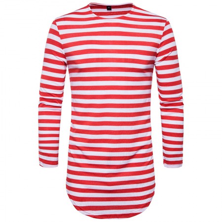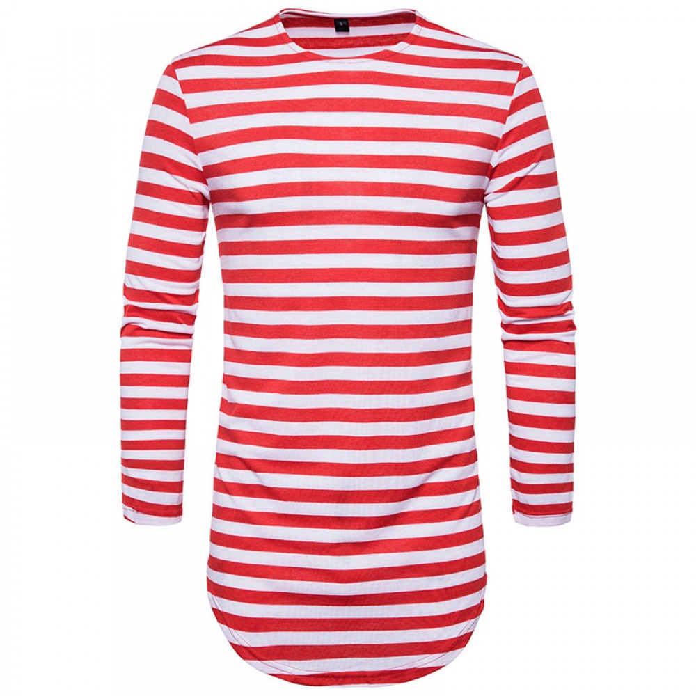 Hip-Hop High Street Summer Men's Round Hem High Street Striped Long T-Shirt